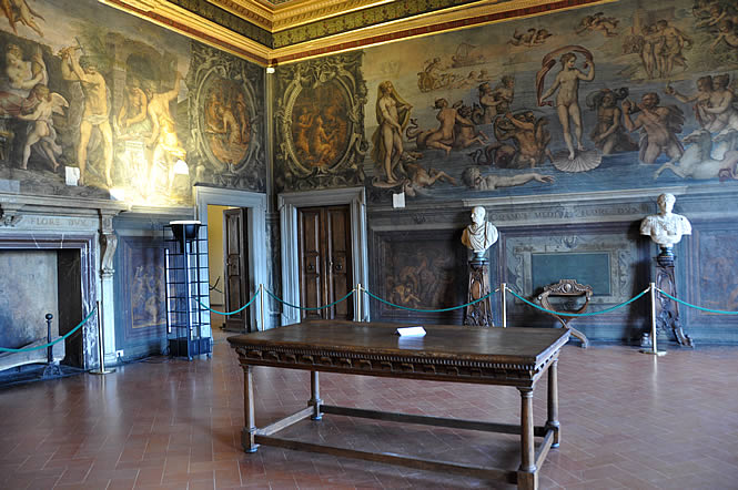 In the apartments of Eleanor of Toledo, the small chapel is sumptuously decorated by Bronzino. A series of rooms, always decorated with frescoes and paintings, leads to the Audience Hall with its superb coffered ceiling.